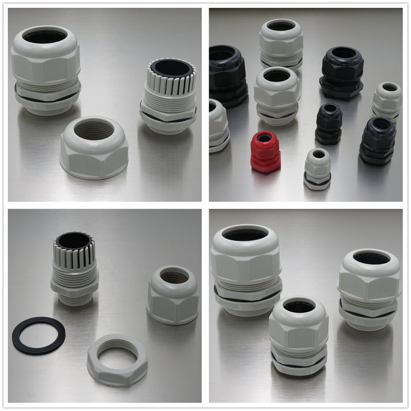 PG Type Plastic Waterproof Cable Gland. A Cable Gland is a device which attach and secure the end of an electrical cable to the equipment. The purpose of a cable gland is to seal the cable and retain it in the electrical equipment that it is attached to. It should maintain the ingress protection rating of the enclosures, keeping out dust and moisture but it should also prevent the cable from being pulled out of the equipment and from being twisted whilst connected to equipment. Cable glands may be used on all types of electrical power, control, instrumentation, data and telecommunications cables. Adopting nylon PA66 certificated by UL. Nitrile butadiene rubber (NBR), Weatheringresistance rubber (EPDM) Working temperature -40C. to 100C. in static state, instantaneous heat resistance up to 120C. -20C. to 80C. in dynamic state, instantaneous heat resistance up to 100C.. IP68 (Rotate the part, and use O ring)