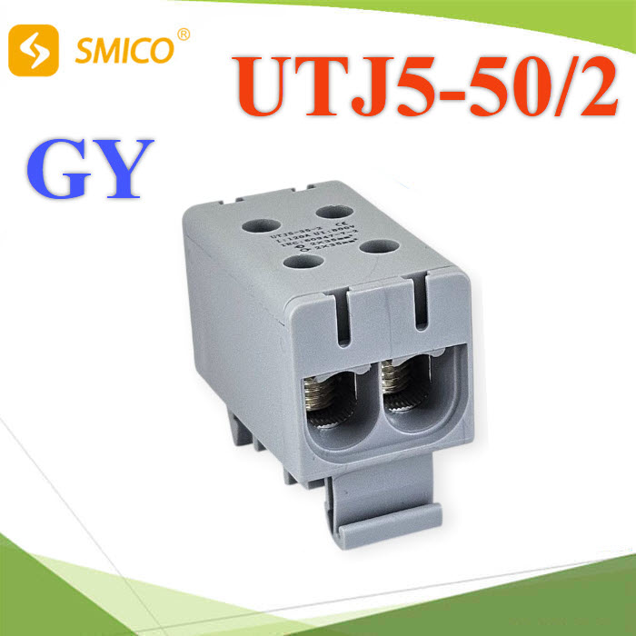 เพาเวอร์ ดิสตริบิวชั่น บล็อก UTJ5-50/2-GY ยึดบนรางปีกนก 2x50 Sq.mm. ด้านบนสีเทา