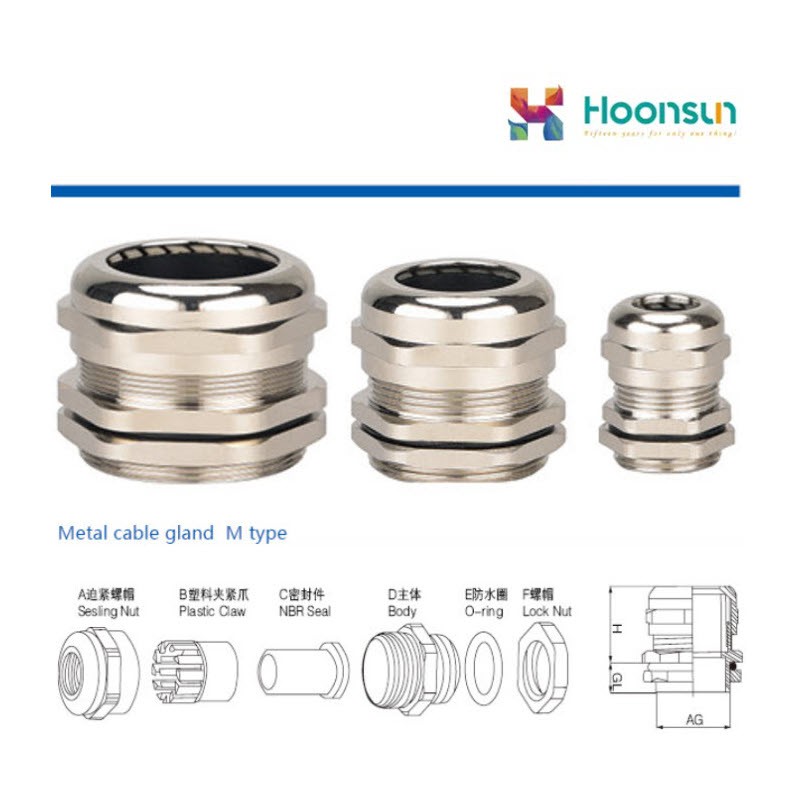 M Type Brass Waterproof Cable Gland. Thread type Metric. Material Brass nickel plated. Sealing and sealing ring NBR.Patent : National Utility Model Patent Patent no is ZL 201020530888.7.Protection degree : IP68. Temperature Resistance : -40 to 100C short time to 120CFunction : Extremely easy installation,simply insert cable through the assembled gland and tighten gland locknut until cable is secured.These cable glands are designed to withstand water,dust salt acid-base,alcohol,oil and common solvent.