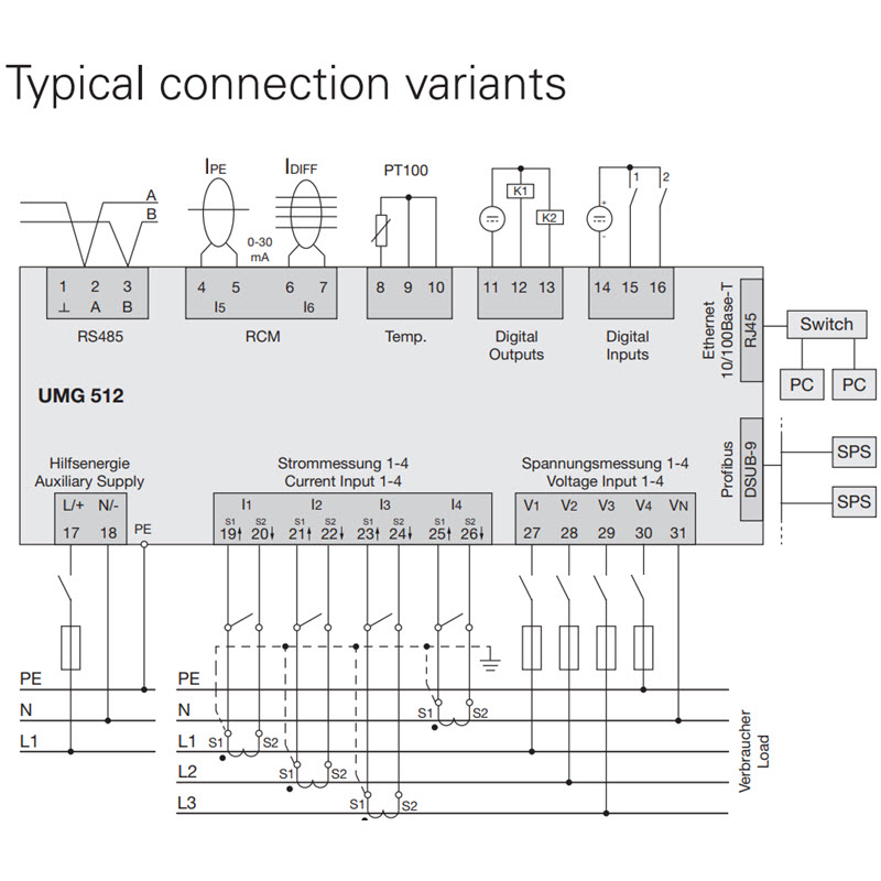 All power quality parameters are collected and analysed e.g. flicker, short term interruptions with fault recorder function, transients, harmonics up to the 63rd and inrush currents etc.Extensive communication possibilities e.g. RS 485 Modbus, Profibus, Ethernet (TCP/IP), BACnet, http, FTP, SMTP, SNTP, DNS.allow cost effective and rapid integration in existing communication networks.