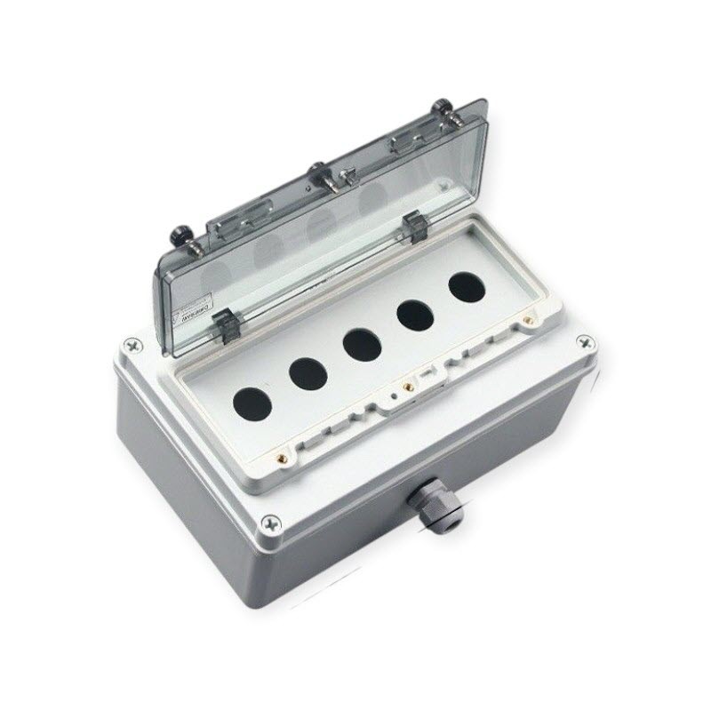 กล่องเปล่ากันน้ำ 5 ช่อง สำหรับปุ่มกด Push Button Waterproof Push Button Switch Box Enclosure Waterproof enclosure box for two 22mm push button switches. Made from high-quality ABS plastic with a protective transparent cover. ขาย กล่องเปล่ากันน้ำ สำหรับปุ่มกด Push Button กล่องเปล่ากันน้ำสำหรับติดตั้งปุ่มกดขนาด 22mm ผลิตจากพลาสติก ABS คุณภาพสูง พร้อมฝาครอบใสป้องกัน