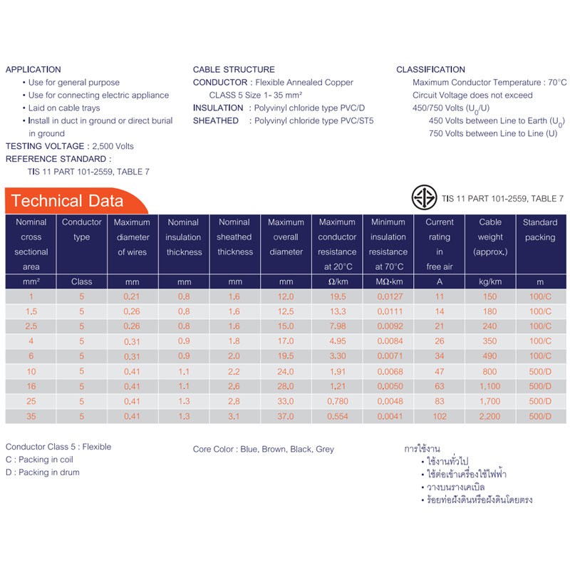 สายไฟ VCT TIS 11-2559 ฉนวนพีวีซี สายอ่อน 4 Core 25mm2 ใช้ภายนอก (ตัดขั้นต่ำ 20 เมตร) VCT 450/750 V. 70C FLEXIBLE CONDUCTOR. PVC INSULATED and SHEATHED 4 CORE. TIS 11-2559 PART 101, TABLE 7 ขาย สายไฟฟ้า VCT สายไฟกลม 4 แกน ภายในประกอบด้วยเส้นลวดตัวนำที่ทำด้วยทองแดงฝอย หุ้มฉนวนพีวีซี นำมารวมแกน และเปลือกหุ้มพีวีซีอีกชั้นหนึ่ง คุณสมบัติอ่อนตัว ทนต่อสภาพการสั่นสะเทือน ใช้งานทั่วไป ใช้ต่อเข้าเครื่องใช้ไฟฟ้า วางบนรางเคเบิ้ล ร้อยท่อฝังดิน หรือฝังดินโดยตรง ใช้งานที่แรงดันไฟฟ้าไม่เกิน 450/750 V. และอุณหภูมิตัวนำไม่เกิน 70 องศา